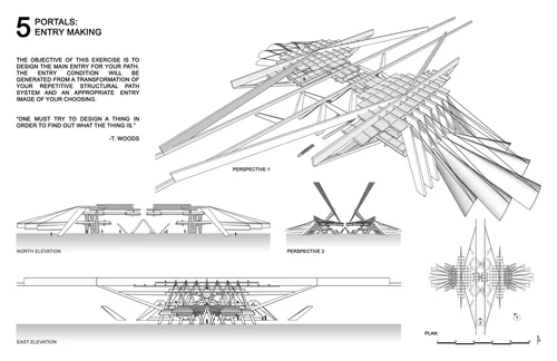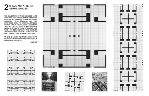 Emphasis on the comprehension of delineators of space as abstract entities and on the theoretical development of design concepts. A sequence of exercises guides the transformation of basic design into elementary architectural design and progresses from a single space and its adjacencies to sequences of spaces with specific functions.